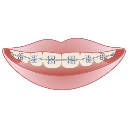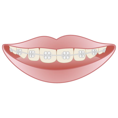 最も一般的に使用されている金属製の矯正装置です。歯の表面に金属製のブラケット(矯正装置)を取り付け、その中に金属製のワイヤーを通します。目立ちますが、丈夫で他の矯正装置と比べると比較的安価です。